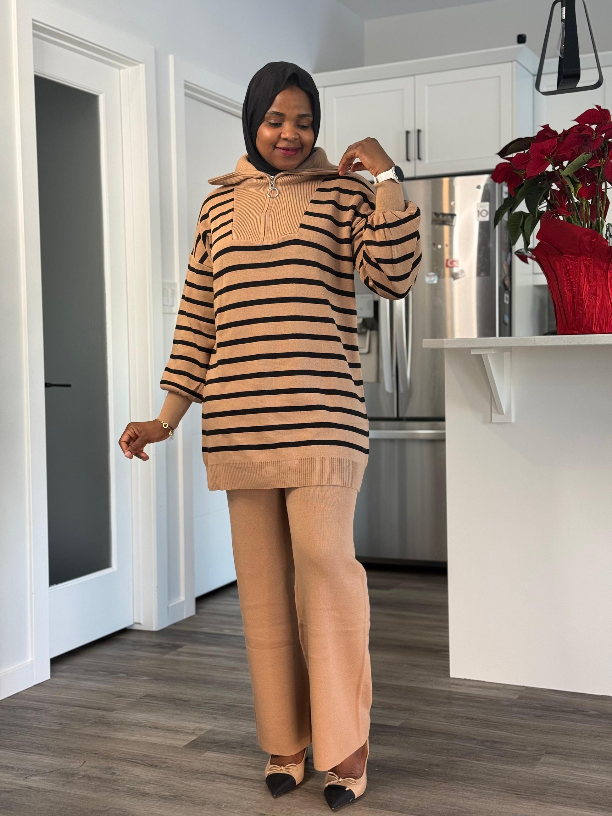 Zipper neck Co Ord Set - Nude